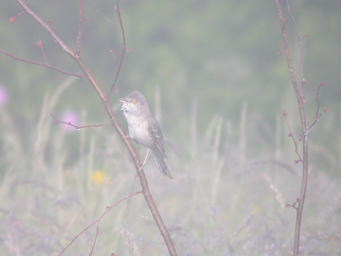 Ancora immersi nella nebbia del primo mattino, un maschio di BIGIA PADOVANA ci mette un po' di tempo a lasciarsi convincere ad uscire allo scoperto dal nostro richiamo, poi viene a guardarci con gli occhi gialli con sguardo incazzoso da "épervier", come dicono i francesi.